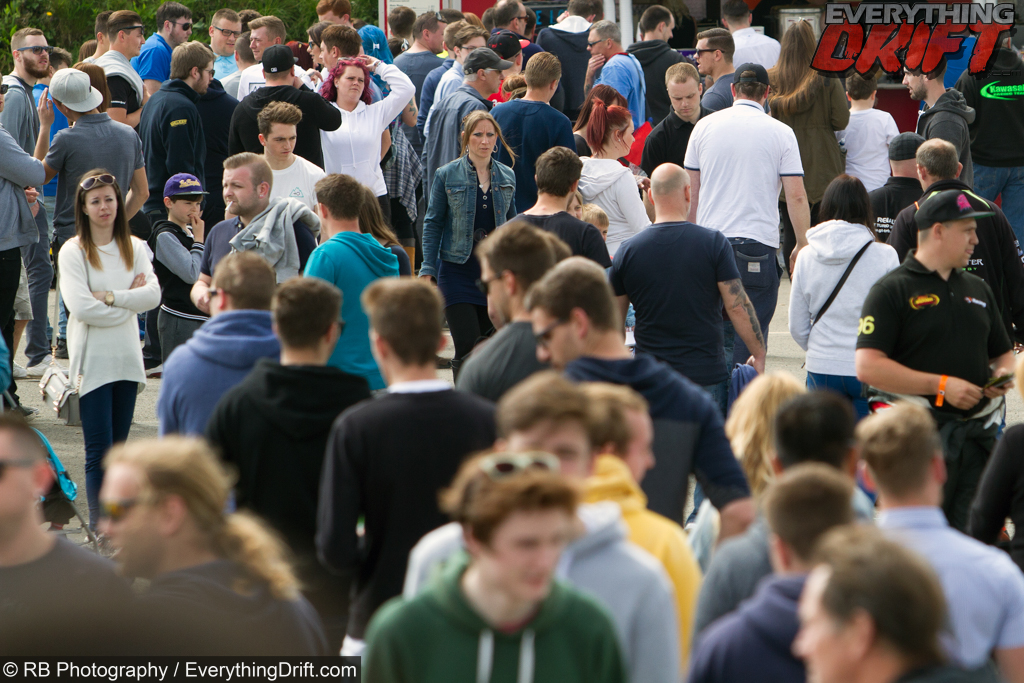 The crowds packed themselves tightly against the fence around the circuit to see the 8 drifters on track. A few practice sessions earlier in the day would provide the drivers with enough time to go wild and put on a show, often filling the natural bowl of the circuit with smoke.