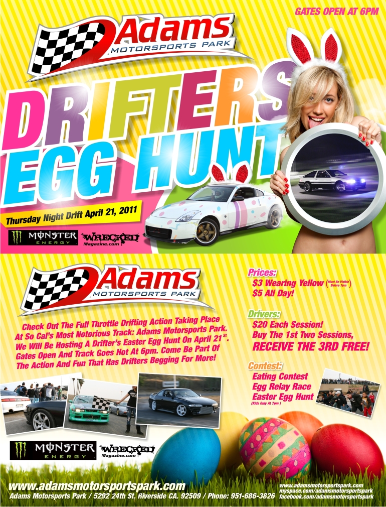 Adams Motorsports Park: Drifter’s Egg Hunt – April 21st, 2011 Posted on April 20, 2011 by George Going down tomorrow at AMP in Riverside. Come for the drifting, stay for the egg hunt…