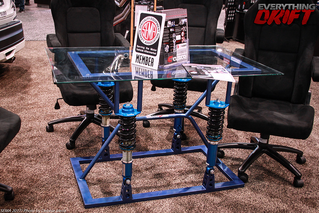 If you’re coming out to SEMA on the hunt for furniture look no further; this adjustable coilover table from the folks at CUSCO USA will support as many fried turkeys or presents as you can stack on it during this holiday season.