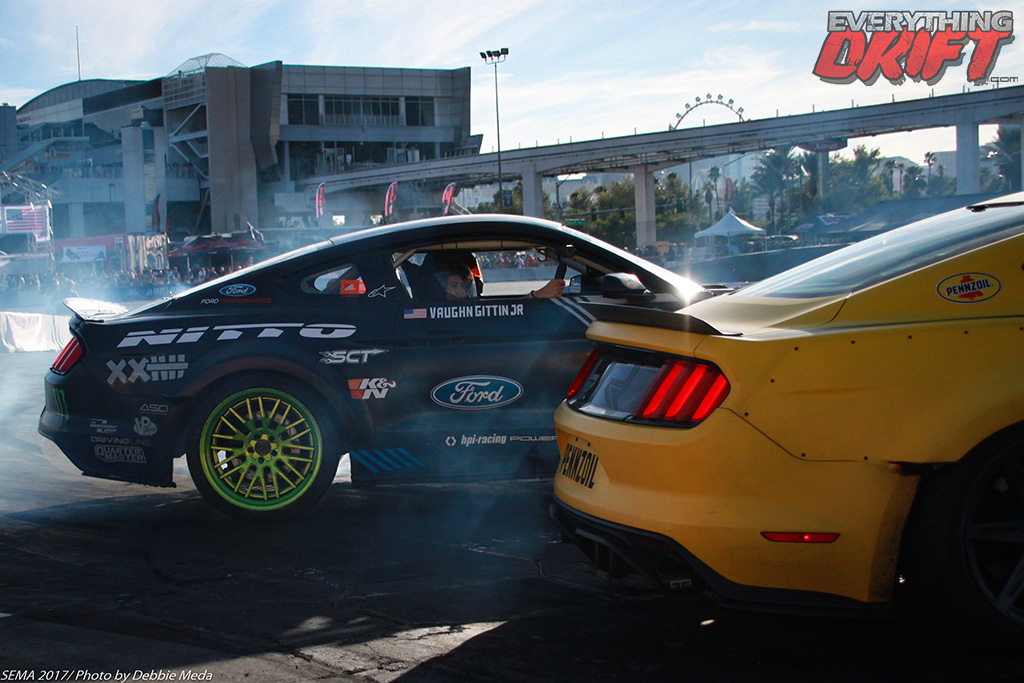 The ponies of the Formula DRIFT Mustang duo were turnin’ and burnin’ on the tandems as Vaughn Gittin Jr. and Chelsea DeNofa not only gave vicious rides but put in plenty of low speed tandem practice.
