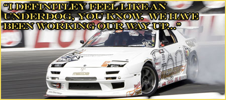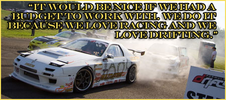 KM: Yeah, but it is very tough. I mean, just getting sponsors is difficult with the economy the way it is. I think that’s definitely affecting privateers as well as the bigger teams. I’m just thankful that we’ve got some good support this upcoming season while were going to be out there. I know there are a lot of other teams out there struggling. The economy is playing a part, and being a privateer it just means you don’t have the support of that one big sponsor. In my case, I own the car, I work on the car, my friends and family help me. It would be nice if we had a budget to work with. We do it because we love racing and we love drifting.