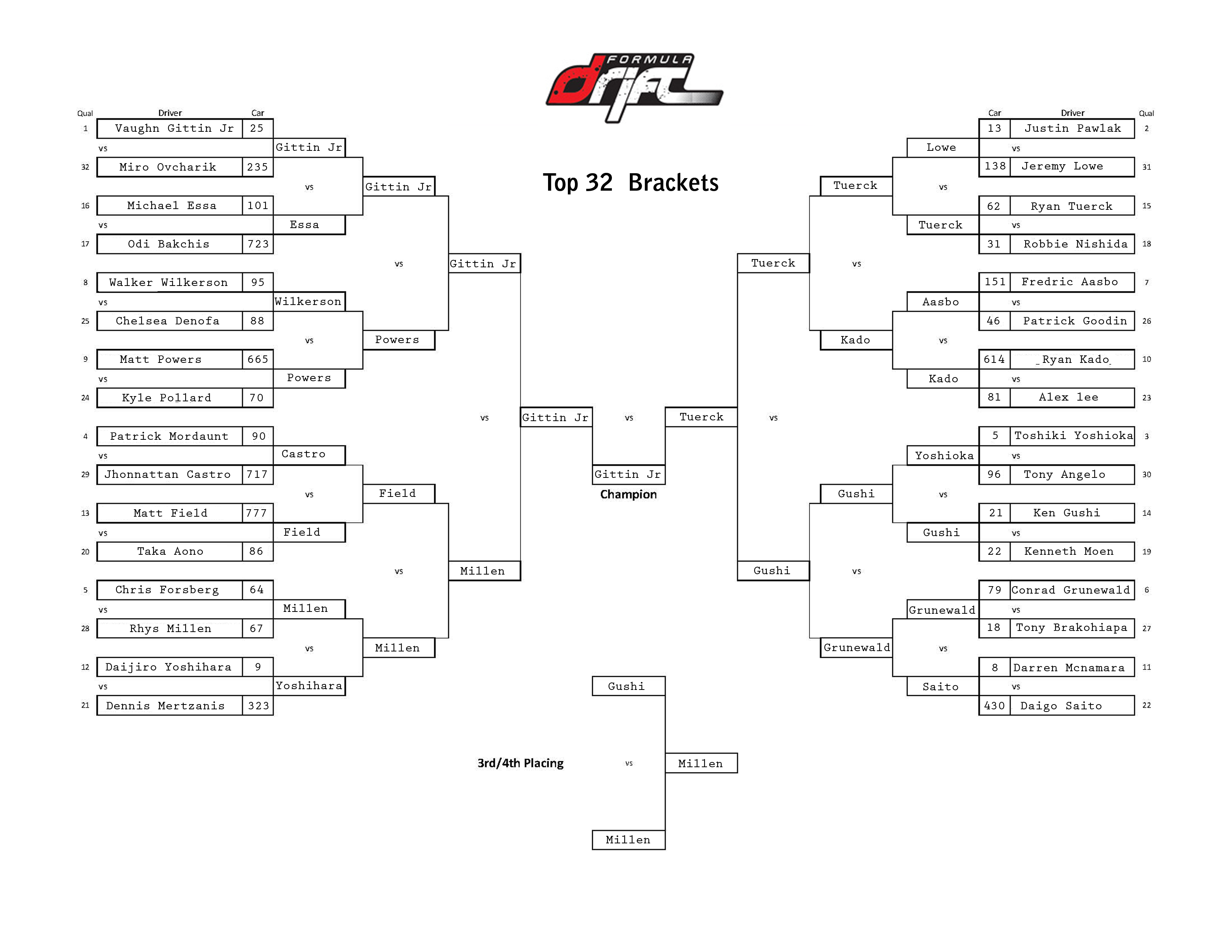 Formula D Rd.5 Results Bracket. Posted on July 21, 2012 by Toxic Congratulations to all the Podium drivers at yet another amazing Formula D event. 1st. Vaughn Gittin Jr. 2nd. Ryan Tuerck 3rd. Rhys Millen