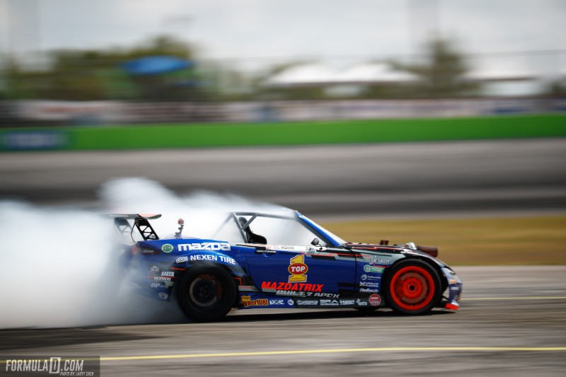 May 08, 2017 (Signal Hill, Calif.) – With high hopes based on last year’s performance, the Kyle Mohan Racing team unpacked the Built 2 Apex / Mazdatrix / KMR MX-5 from the trailer in Orlando, Florida ready to kick off the east coast leg of the Formula Drift Pro Championship series. This event, however, provided its fair share of challenges for the KMR Team who discovered unforeseen gremlins in the MX5 during Thursday’s practice, launching a trip to local Mazda race shop Kilo Racing and a very late night for the KMR team. Fortunately, the team was able to repair the issues and put the vehicle on track Friday to qualify for the big show on Saturday. Fans packed the Orlando Speedworld stadium for Saturday’s competition and cheered for Mohan who campaigns the only Mazda rotary powered platform in the series. Mohan was paired with Ken Gushi in the top 32 tandem battle. Gushi had a strong lead run, but Mohan was able to maintain good proximity and angle in the chase position. Mohan took the lead position in the second tandem battle and laid down a strong and consistent lead run with a big gap in front of Gushi. The judges unanimously gave the win to Mohan. In the top 16 tandem battle, Mohan fought hard against FD champion Vaughn Gittin Jr. in a close match, but didn’t advance. “Our team overcame many challenges this round with very little sleep, but we were able to persevere and advance through the competition. I’m very proud of our efforts and abilities, and I can’t wait to get back on track for next round in Atlanta!”